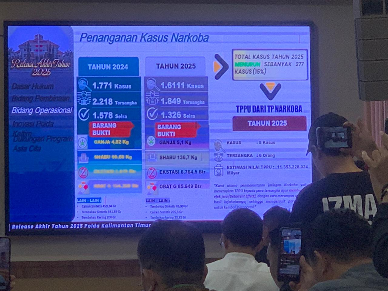 “Jumlah kasus memang menurun, tetapi barang buktinya meningkat tajam. Ini menunjukkan bahwa yang kita hadapi bukan hanya pengguna, melainkan jaringan narkoba yang lebih besar,” ujar Endar saat rilis akhir tahun Polda Kaltim.