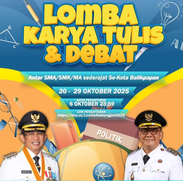 metroikn, BALIKPAPAN – Dalam rangka memperingati Hari Sumpah Pemuda (HSP) ke-97 tahun 2025, Badan Kesatuan Bangsa dan Politik (Kesbangpol) Kota Balikpapan kembali menggelar Lomba Karya Tulis dan Debat Kebangsaan bagi pelajar SMA/SMK/MA se-Kota Balikpapan. Kegiatan akan berlangsung mulai 20 hingga 29 Oktober 2025, dengan pendaftaran peserta dibuka hingga 6 Oktober 2025 pukul 23.59 WITA.