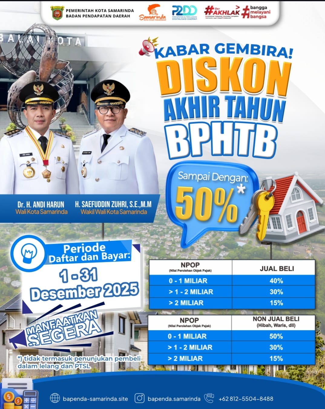 “Diskon BPHTB ini adalah momentum emas. Kami imbau warga segera memanfaatkannya karena potongannya cukup besar dan hanya berlangsung selama Desember,” ujarnya.