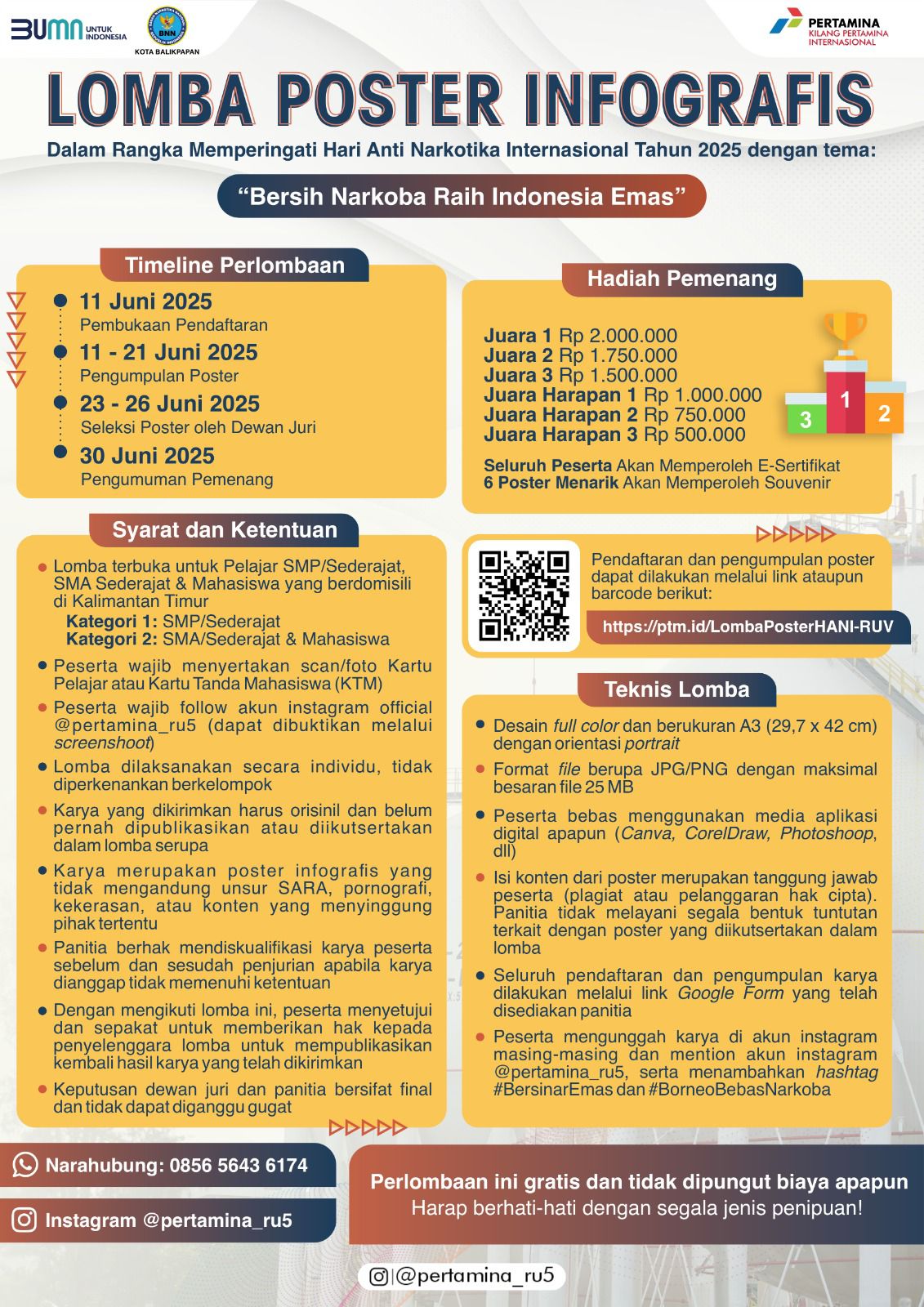 Peserta lomba diminta untuk membuat poster edukatif bertema hidup sehat dan produktif tanpa narkoba, menggunakan aplikasi desain seperti Canva, Photoshop, atau Adobe Illustrator. Karya wajib orisinil dan tidak mengandung unsur SARA, kekerasan, atau pornografi. Poster diunggah melalui akun Instagram pribadi masing-masing peserta dengan mention ke akun @pertamina_ru5.