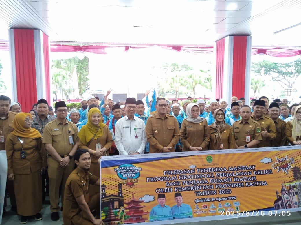 Prosesi pelepasan digelar di Kantor Gubernur Kaltim, ditandai dengan penyerahan bendera program Gratispol oleh Wakil Gubernur Kaltim, Seno Aji, kepada perwakilan jemaah.
