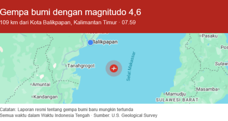 Gempa M 4,6 Guncang Balikpapan, BMKG: Tidak Berpotensi Tsunami Balikpapan|18 Juli 2025oleh Admin Web metroikn, BALIKPAPAN – Gempa bumi dengan kekuatan Magnitudo 4,6 mengguncang wilayah Balikpapan,