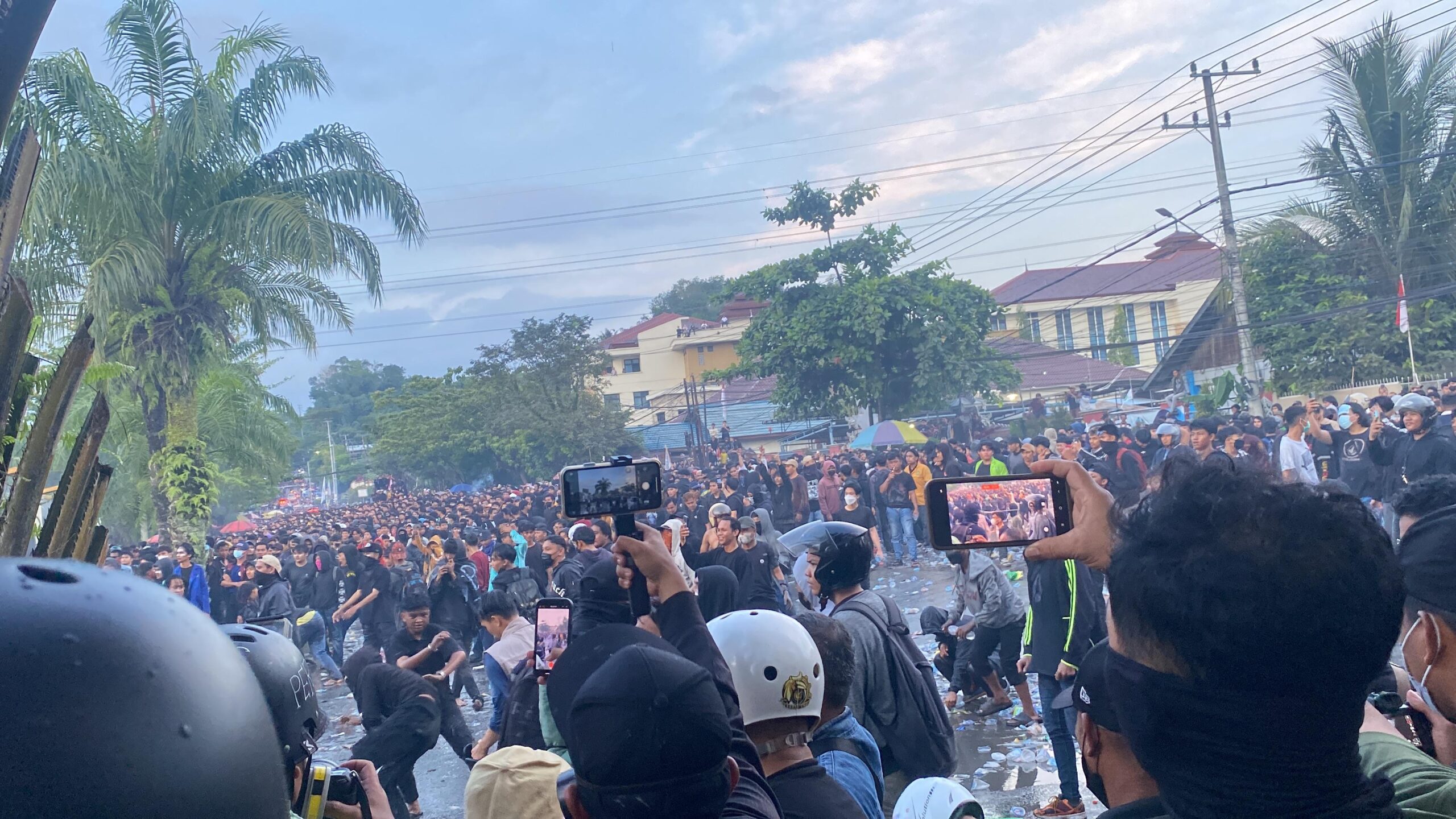 Aparat kepolisian yang berjaga langsung menembakkan gas air mata dan mengerahkan water cannon. Barisan polisi berperisai lengkap menutup jalan utama di depan DPRD Kaltim untuk menahan gelombang massa.