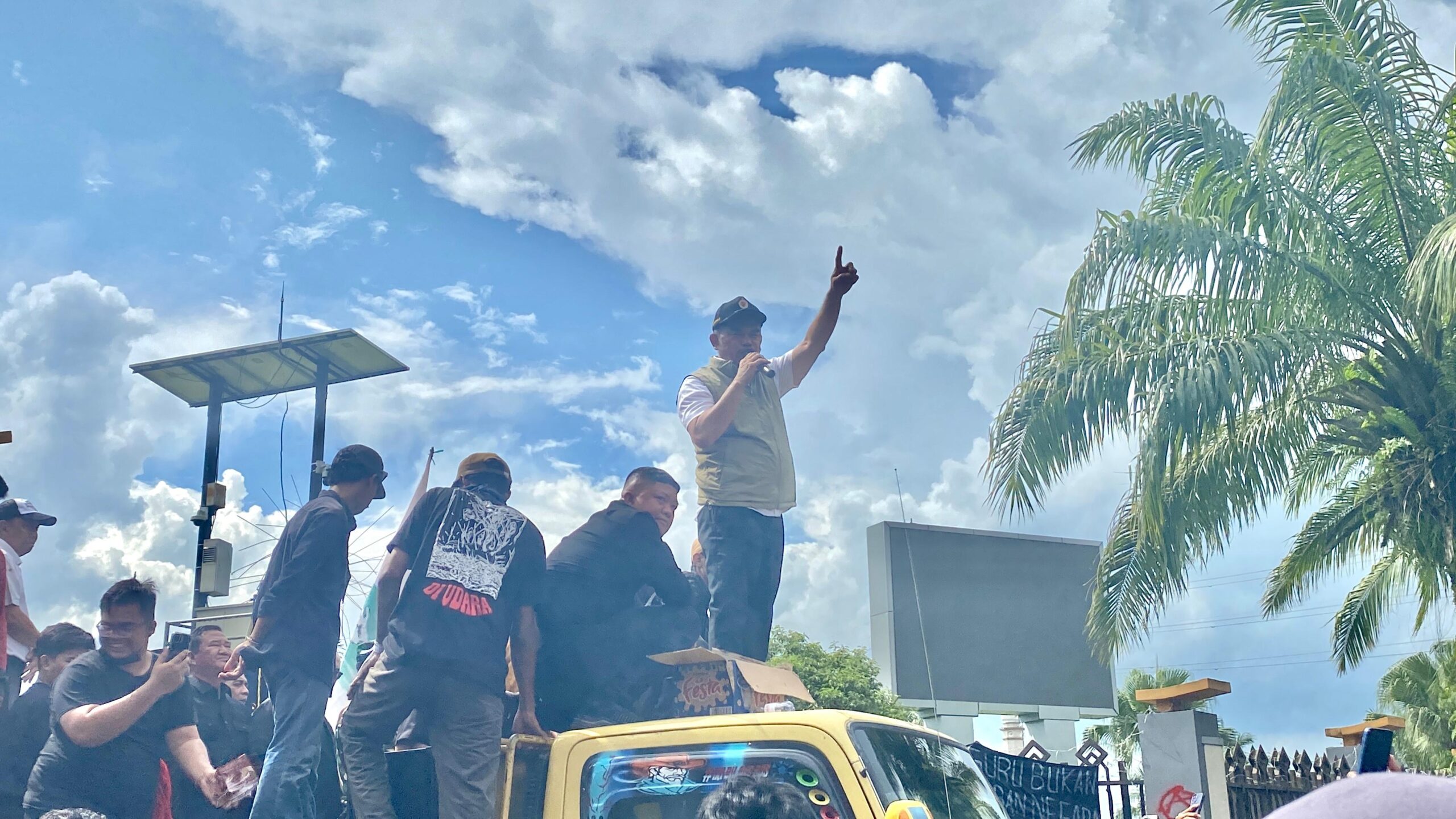 Dengan pengeras suara di hadapan ribuan massa, Hasanuddin menegaskan DPRD Kaltim memahami keresahan mahasiswa dan masyarakat.